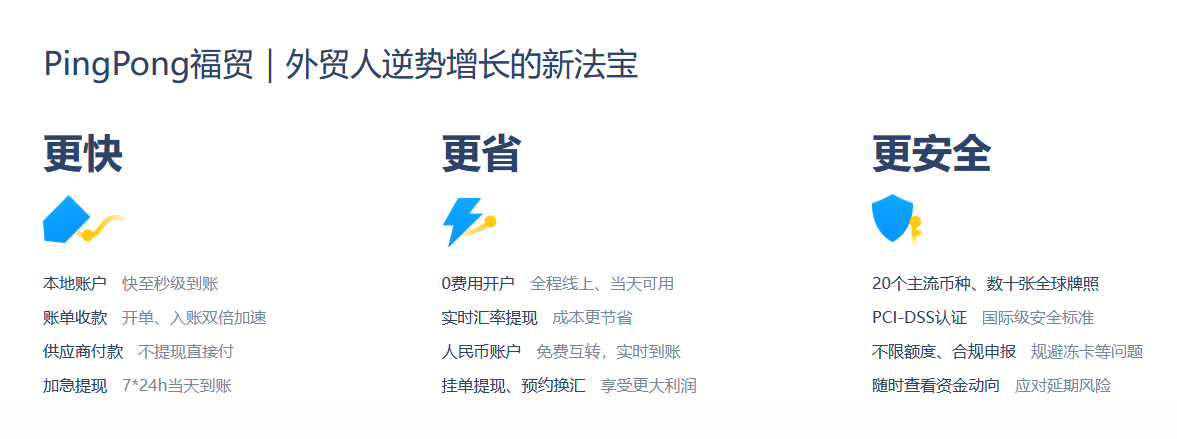 在此背景之下,進(jìn)一步挖掘外貿(mào)企業(yè)的數(shù)字化轉(zhuǎn)型高新技術(shù)賦能將成為我國(guó)外貿(mào)經(jīng)濟(jì)建設(shè)的關(guān)鍵步伐。而對(duì)此,PingPong福貿(mào)作為國(guó)內(nèi)外貿(mào)收付領(lǐng)域的數(shù)字先行者,充分發(fā)揮了自身強(qiáng)大的數(shù)字技術(shù)應(yīng)用能力和全球收付服務(wù)建設(shè)能力,打造了一站式數(shù)字化外貿(mào)收付款解決方案,致力為廣大中小外貿(mào)企業(yè)降低國(guó)際貿(mào)易成本,推動(dòng)企業(yè)通過數(shù)字賦能在全球貿(mào)易競(jìng)爭(zhēng)中具備強(qiáng)勁實(shí)力。