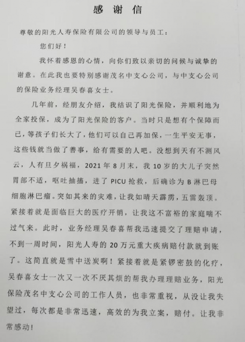 獲取病案資料后,工作人員再次協(xié)助梁女士提交少兒特定疾病的理賠申請,不到一個工作日,20萬元理賠金便順利支付至梁女士賬戶。在收到這份“意料之外”的理賠金后,梁女士特地從北京寄來了感謝信及錦旗,她說:“是陽光人壽一直以來的支持,讓我兒有重獲新生的希望,是陽光透過業(yè)務(wù)人員傳來的大愛,讓我們一路勇往前行。此刻一切文字都無法表達(dá)我的感激之情!”