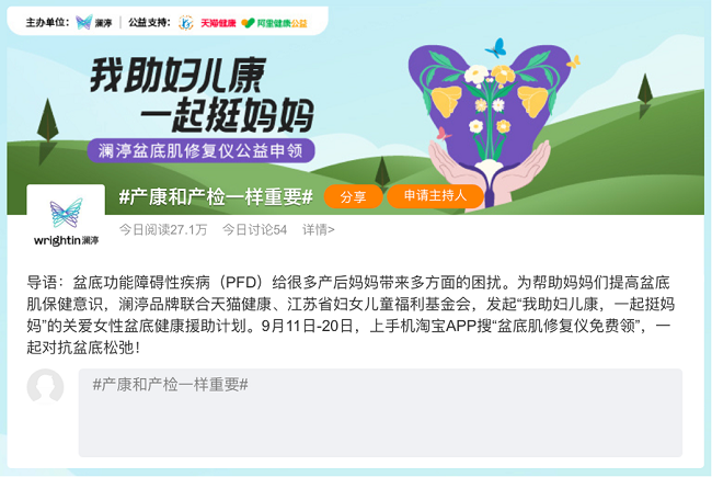 今年9月,瀾渟聯(lián)合天貓健康、阿里健康公益、江蘇省婦兒基金會四方聯(lián)合發(fā)起的線上公益活動“我助婦兒康,一起挺媽媽”,免費申領(lǐng)瀾渟盆底肌修復(fù)儀,總計50 臺盆底康復(fù)治療儀,兩天時間里,微博話題閱讀量超1.5億,推動公眾對女性盆底健康問題的關(guān)注與支持。