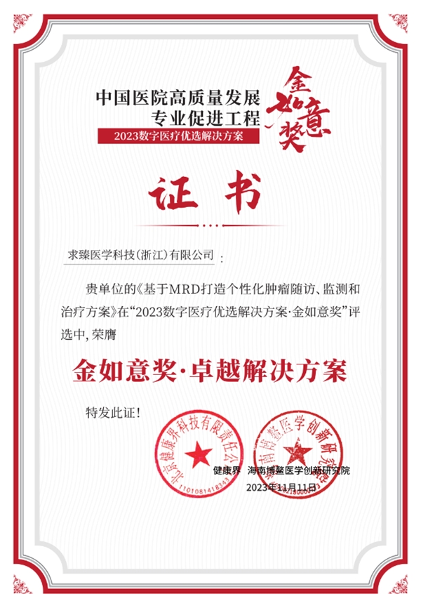2023年11月11日,由健康界、海南博鰲醫(yī)學(xué)創(chuàng)新研究院和中國(guó)醫(yī)藥教育協(xié)會(huì)數(shù)字醫(yī)療專(zhuān)業(yè)委員會(huì)聯(lián)合主辦的第三屆“金如意獎(jiǎng)”數(shù)字醫(yī)療優(yōu)選解決方案評(píng)選頒獎(jiǎng)典禮,在2023中國(guó)醫(yī)院管理年會(huì)上揭曉榜單并頒獎(jiǎng)。求臻醫(yī)學(xué)MRD產(chǎn)品解決方案榮獲第三屆金如意獎(jiǎng)最 高獎(jiǎng)項(xiàng)——卓越獎(jiǎng),這是對(duì)公司在臨床科研和轉(zhuǎn)化醫(yī)學(xué)領(lǐng)域的杰出貢獻(xiàn)的肯定。
