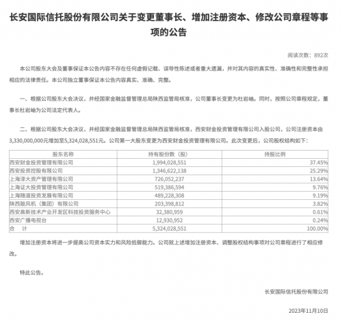 隨后,長安信托在10月底完成章程修訂,11月完成了所有的變更手續(xù),并在官網(wǎng)發(fā)布公告。