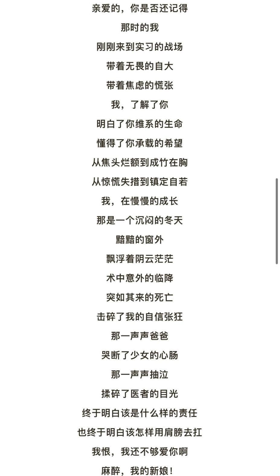 在郭晨主任的世界里,醫(yī)學(xué)不僅是科學(xué),也是藝術(shù),正如他鐘愛的詩歌一般。在手術(shù)室的嚴(yán)謹(jǐn)和緊張之余,郭主任常在詩中尋找慰藉和靈感。他熱愛寫詩,用文字描繪麻醉工作中的微妙情感和深刻體悟。他的詩句中,充滿了對(duì)生命的贊美和對(duì)工作的熱愛,詩意般的語言,不僅表達(dá)了他對(duì)麻醉學(xué)科的深厚情感,也展現(xiàn)了他作為醫(yī)生的人文關(guān)懷和藝術(shù)氣質(zhì)。