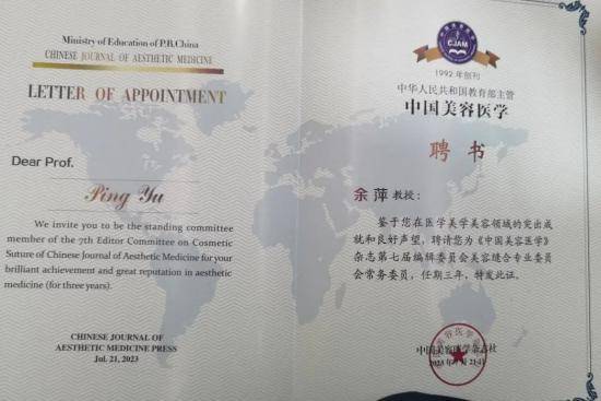 ☆圖為余萍院長(zhǎng)被聘請(qǐng)為中國(guó)整形美容協(xié)會(huì)等部分分會(huì)常委及《中國(guó)美容醫(yī)學(xué)》雜志美容縫合專業(yè)委員會(huì)常委等