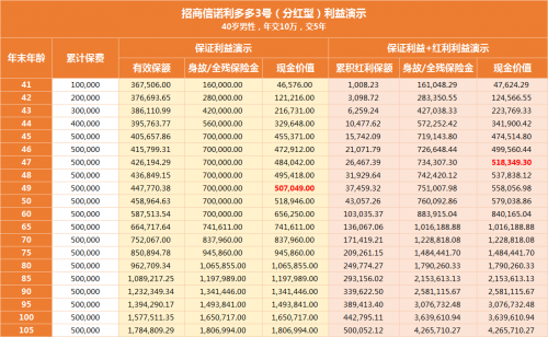招商信諾利多多3號(hào)(分紅型)有效保額每年以2.5%遞增,抵御不確定的市場(chǎng)變化。以40歲男性投保利多多3號(hào),年交10萬(wàn)為例,假設(shè)紅利實(shí)現(xiàn)率達(dá)到100%,依照紅利演示,長(zhǎng)期保單總利益可以超過(guò)總保費(fèi)的8倍多!