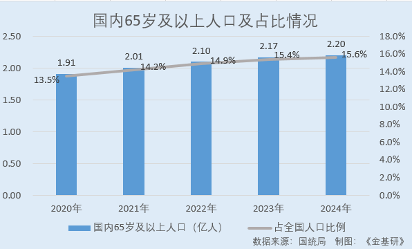 據(jù)國(guó)家統(tǒng)計(jì)局?jǐn)?shù)據(jù),2020-2024年,國(guó)內(nèi)65歲及以上人口分別為1.91億人、2.01億人、2.10億人、2.17億人、2.20億人,占當(dāng)年度全國(guó)人口的比例分別為13.5%、14.2%、14.9%、15.4%、15.6%。