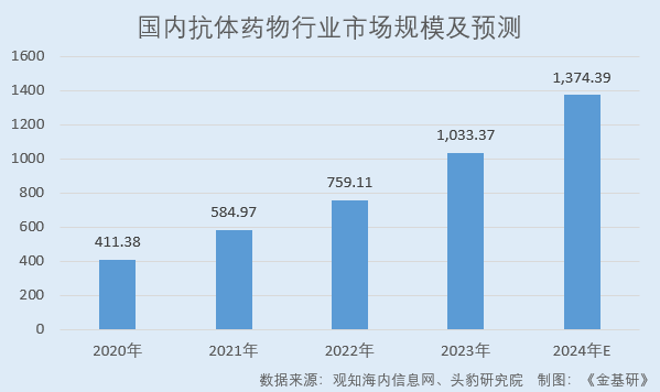 據(jù)觀知海內(nèi)信息網(wǎng)數(shù)據(jù),2020-2023年,國(guó)內(nèi)抗體藥物行業(yè)市場(chǎng)規(guī)模分別為411.38億元、584.97億元、759.11億元、1,033.37億元。頭豹研究院預(yù)計(jì),2024-2028年,國(guó)內(nèi)抗體藥物行業(yè)市場(chǎng)規(guī)模由1,374.39億元增長(zhǎng)至3,530.76億元,期間年復(fù)合增長(zhǎng)率26.60%。