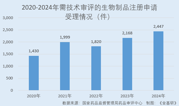 據(jù)國(guó)家藥監(jiān)局藥品審評(píng)中心發(fā)布的《2024年度藥品審評(píng)報(bào)告》,2020-2024年,國(guó)內(nèi)需技術(shù)審評(píng)的生物制品注冊(cè)申請(qǐng)數(shù)量分別為1,430件、1,999件、1,820件、2,168件、2,447件,近五年CAGR達(dá)14.37%。
