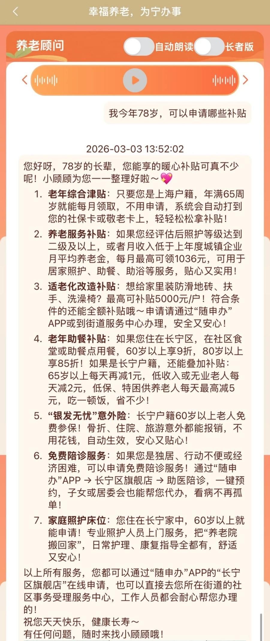 老年群體無需前往民政窗口或社區(qū)服務中心,只需登錄隨申辦APP即可輕松使用“養(yǎng)老顧問”服務,無論是居家老人、行動不便群體,還是偏遠社區(qū)居民,都能隨時隨地獲取專業(yè)的智能養(yǎng)老咨詢服務,實現(xiàn)了養(yǎng)老服務“無死角”覆蓋,生動踐行了“就近可辦、便捷可及”的服務理念,讓AI技術的普惠價值在養(yǎng)老服務領域充分彰顯。