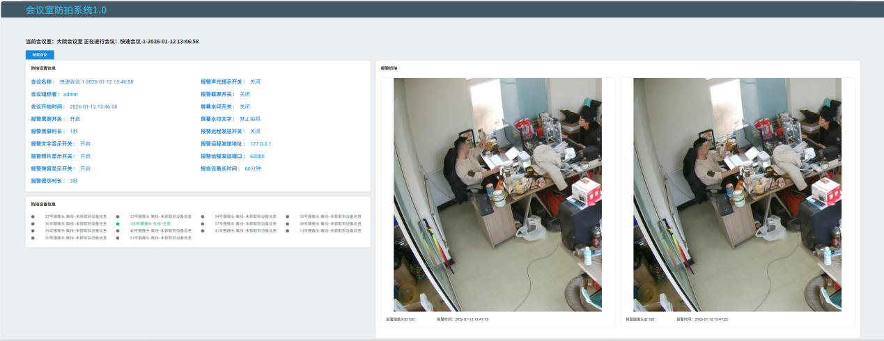 摒棄傳統(tǒng)人工排查的滯后性,系統(tǒng)實(shí)現(xiàn) 2 秒極速處理響應(yīng),檢測到違規(guī)拍攝行為的瞬間,無需人工干預(yù),自動(dòng)觸發(fā)智能告警機(jī)制。告警信息以全屏高亮彈窗、醒目警示文字形式直接展示在會(huì)議屏幕,“請(qǐng)注意,有人拍照” 等提示清晰直觀,在場人員可第一時(shí)間察覺竊照行為,為現(xiàn)場制止泄密爭取黃金時(shí)間,同時(shí)對(duì)意圖偷拍者形成強(qiáng)力心理震懾,有效遏制會(huì)議室防拍照、空間防拍照?qǐng)鼍跋碌母`照行為實(shí)施,強(qiáng)化涉密空間防拍的現(xiàn)場警示效果。